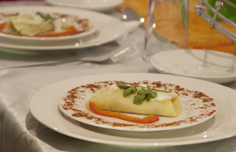 Take one pancake and fill the pancake with chicken filling roll it up and cut in half. Decorate your plate with paprika on the edge of the plate, place the folded pancake. Drizzle a teaspoon of white sauce over and add two slice of red pepper on each side.
