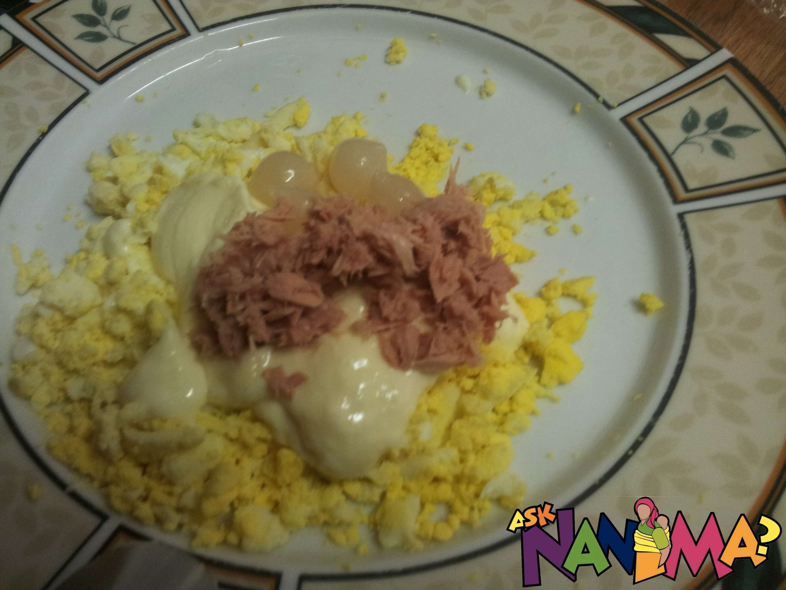 Mix smashed avo, eggs and mayo. Drain the tuna so it is dry and has no liquid. Add tuna into mixture. Add pickled onions.