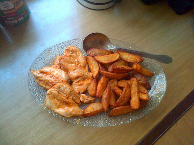 Cut potatoes into Wedges- sprinkle over some machos spice, oil, & either AIR-FRY til done or shallow fry.