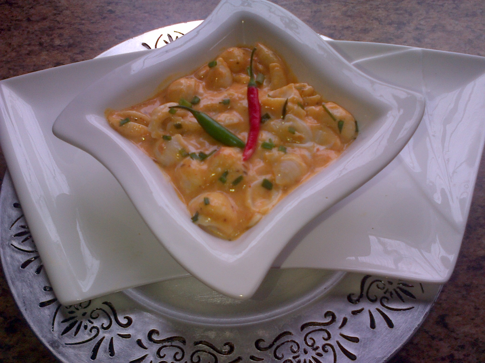1 cup fresh cream. Heat on stove and pour sauce over pasta.season to taste with aromat/salt… Heat just before serving and garnish…